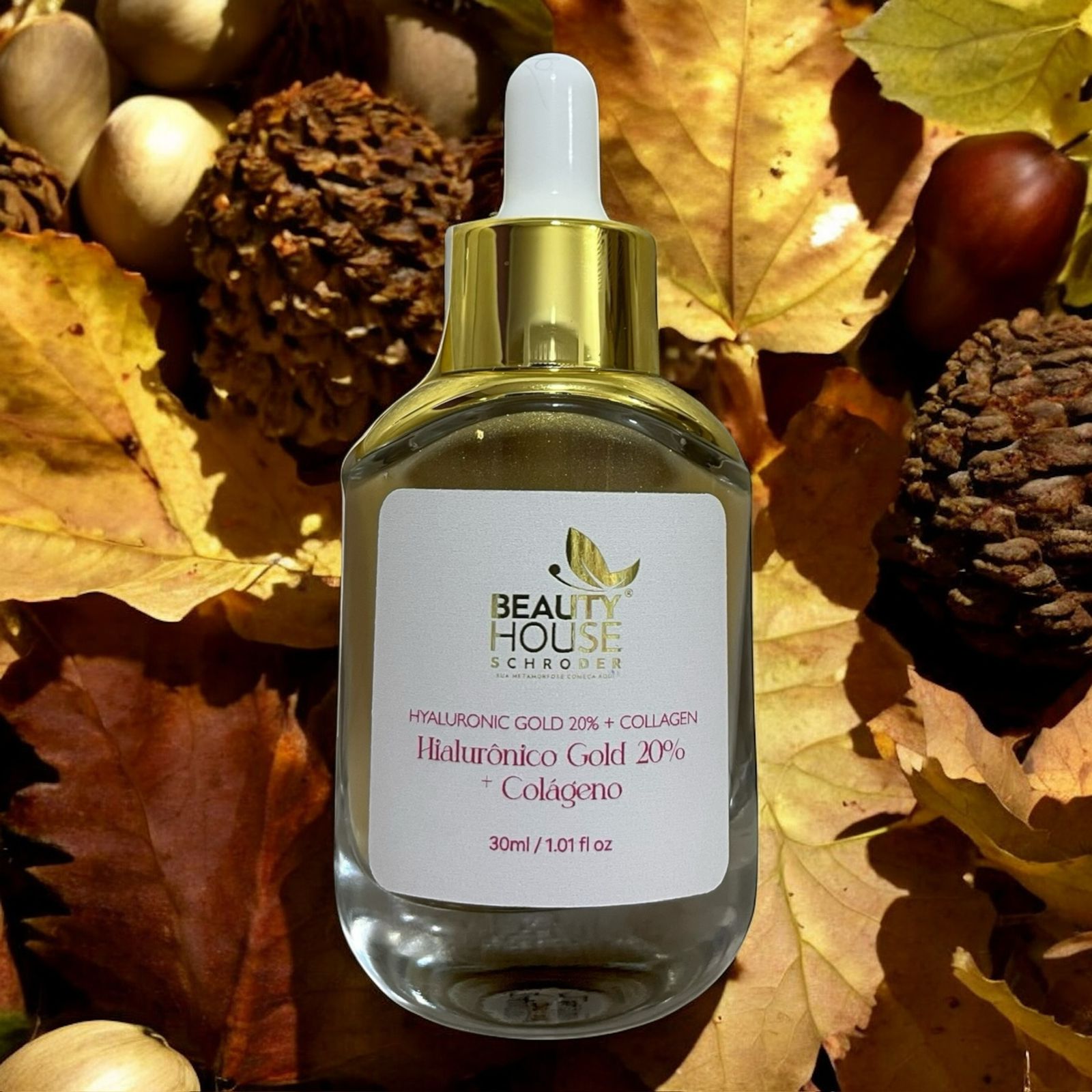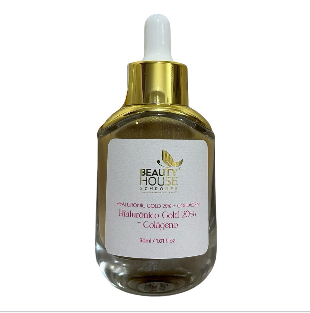 Experimente uma transformação na pele com o Sérum Gold 20% Ácido Hialurônico + Colágeno 30 ml da Beauty House.